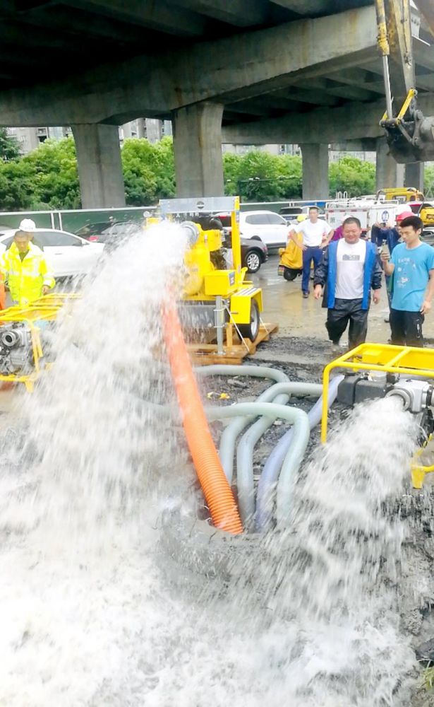 由于排水設備無法跟上降雨量,公司當即請示集團要求應急采購5臺(排水量:150立方/小時)、2臺(排水量:340立方/小時),7臺新家伙第一時間內全部到點作業,圓滿完成排水搶險任務。截止到目前為止,時代大道南岸花城恢復雙車道通行。
