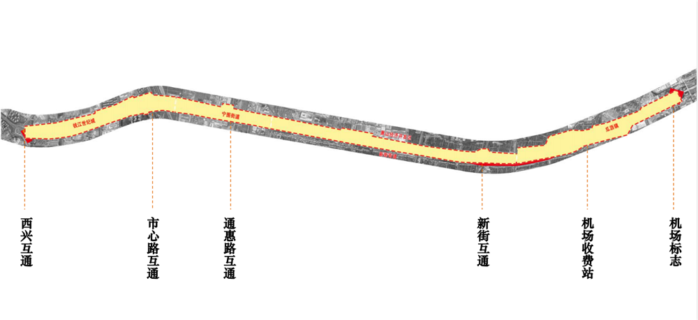 機場公路兩側景觀提升改造工程主要是對道路兩側及中分帶綠化進行提升。實施范圍為機場西大門通航路口至京嵐線路口東側利群河畔,全長約14公里,其中核心段位于空港大道至新街互通段4.9公里。