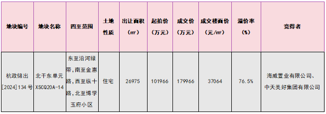 該地塊東至沿河綠帶,南至金惠路,西至縱十路,北至博學玉府小區,出讓面積26975平方米(40.4625畝),1.0≤容積率≤1.8。地塊起始價101966萬元,開拍僅30分鐘,溢價率上升至55%。經過70輪競價,最終由海威置業有限公司、中天美好集團有限公司以179966萬元總價競得,成交樓面價37064元/㎡,溢價率76.5%(溢價率不僅為今年最高,更創杭州市區7年來溢價率新高)。